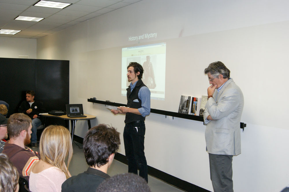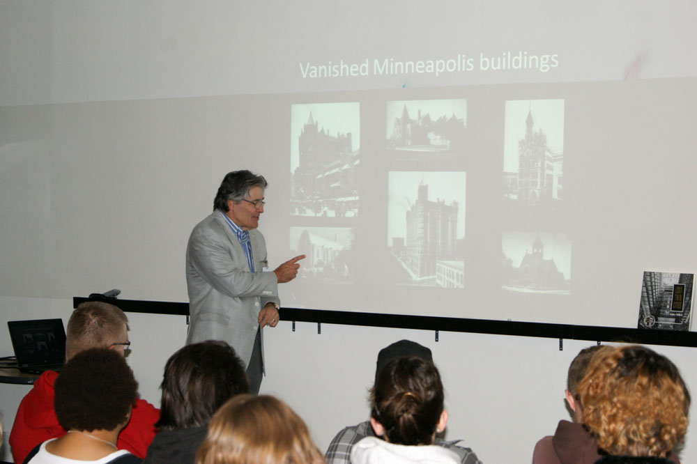 On Thursday, Oct. 1, about 80 students and faculty gathered as Kyle Huberty – Dunwoody’s AIAS Chapter President – introduced Larry Millett at the Design Library’s first Meet the Author Series event. Larry Millett – prominent Minnesota author of both history and mystery books – focused on his body of published work, including his newest book, Minnesota Modern: Architecture and Life at Midcentury, available this fall. Larry Millett wrote many influential Minnesota architecture books including, Lost Twin Cities, the AIA Guide to the Twin Cities, and Once there were Castles.
